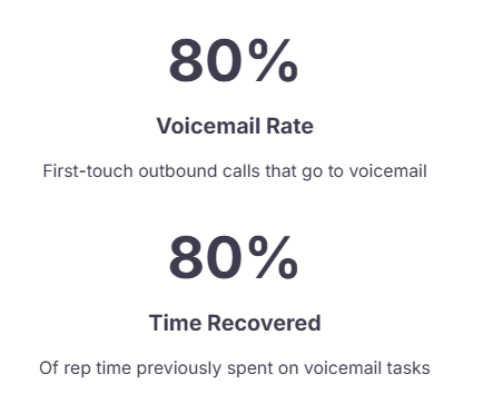 If you previously required a human present on every dial to drop a message, then approximately 80% of rep time on first touches was spent on voicemail-related tasks--listening to rings, waiting for beeps, recording or triggering messages, and logging the attempt.