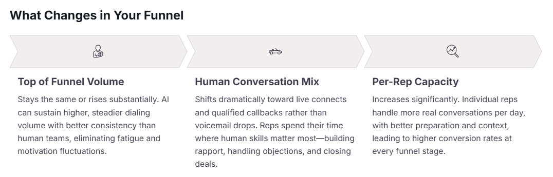 Typical Results: Higher win rates, and more revenue per rep. We've seen companies reduce sales rep headcount by 20-50% while maintaining or growing pipeline by letting AI handle first touches and voicemail at scale, then routing live connects and qualified callbacks exclusively to their best talkers.
