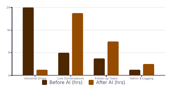 Reps no longer sit in front of auto dialers waiting to press a voicemail button or record messages manually. The AI handles voicemail drops and first-touch attempts autonomously, freeing reps to spend significantly more time in qualified conversations, strategic follow-ups, and closing-stage tasks that require human judgment and relationship building.