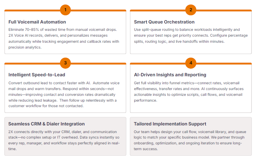 **In short: 2X doesn't just make your sales floor more efficient4it makes it smarter, faster, and more profitable. Whether you want to double productivity with your existing team or strategically streamline your organization, 2X provides the AI workflows and actionable insights to turn every conversation into measurable growth.