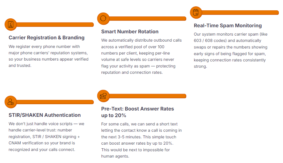 5. Abandon Call Rule: Our system ensures that a live agent connects with the recipient within the required 2-second limit. This helps us keep the number of "abandoned calls" (where no agent is available to speak) below the mandated 3% limit over 30-day periods, with detailed records kept for any regulatory inquiries.