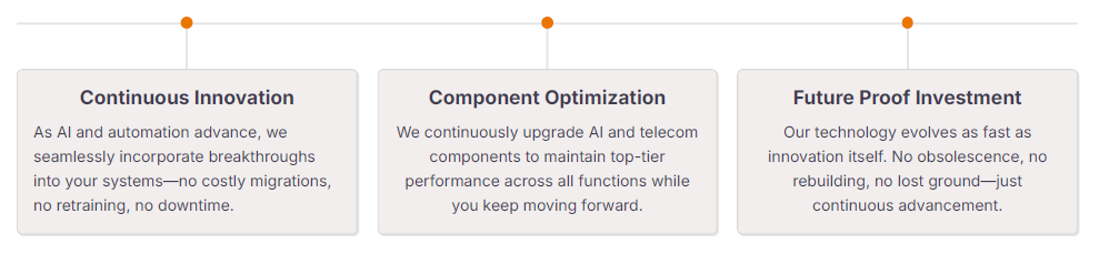 As AI and automation rapidly advance, this gives you a significant advantage. We smoothly add new innovations in voice AI, natural language processing, and telecommunications without expensive overhauls or operational interruptions.
