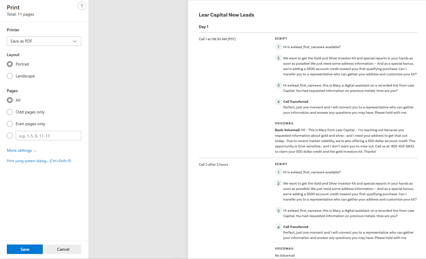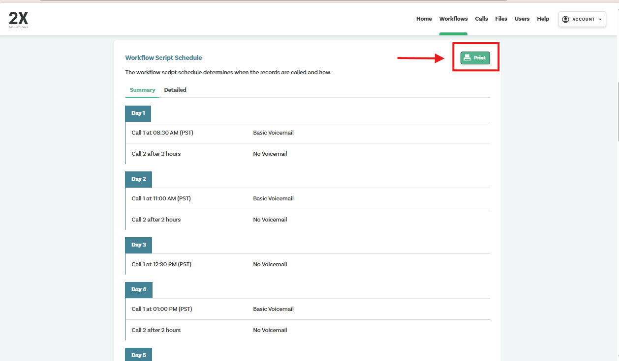 Users are now able to print both the workflow calling schedule and script in one complete document. You may access this feature by selecting the desired workflow and scrolling to the bottom of the page. Select "Print" and a preview of the document will appear.